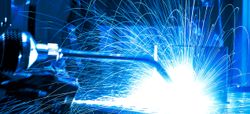 A feeding system on rollers brings two large metal slabs under the two opposing TIG welding units.